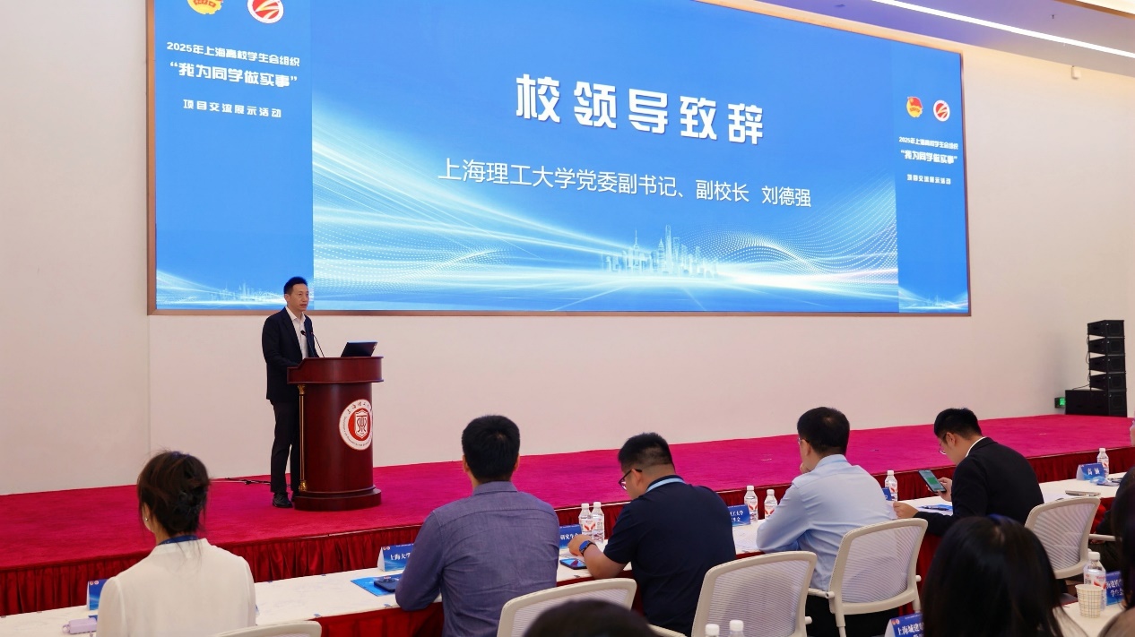 活动伊始,刘德强代表上海理工大学党委向参加活动的师生代表表示最热烈的欢迎和最诚挚的感谢。他指出,本次市级展示活动的成功举办,是深入学习贯彻习近平总书记关于学联学生会工作重要论述的生动实践,也是全面落实全国学联二十八大精神、持续深化学生会组织改革的重要举措。上海理工大学党委始终坚持将学生会建设纳入学校“三全育人”工作格局和思想政治教育工作体系中进行整体谋划,学校党委大力支持学生会组织聚焦同学在思想成长、学业发展、身心健康、社会融入、权益维护等方面的现实需求,打造具有特色、富有实效的服务品牌。最后,他祝愿2025年上海高校学生会组织“我为同学做实事” 项目交流展示活动圆满成功。